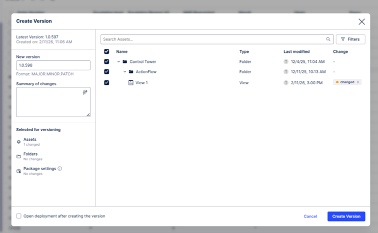 Celonis remplace le “publishing” par un véritable système de versionning et de déploiement pour Studio et les modèles objet‑centrés. Côté Studio, vous versionnez vos packages, déployez en Dev/Prod, testez en sécurité et maintenez plusieurs variantes d’applications (par pays, BU, périmètre) sans duplication hasardeuse. Côté OCDM, vous créez, testez et relâchez des versions numérotées, avec rollback possible à tout moment.