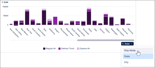 La bascule de dimension dans les charts (barres, colonnes, lignes, aires) permet de changer “à la volée” la perspective d’analyse(hebdomadaire/mensuelle, Région/Segment/Canal, etc.) via un simple menu déroulant. Pour les développeurs l’utilisation de variables parfois complexe ; pour les utilisateurs, l’exploration devient vraiment self‑service, plus rapide et plus naturelle, sans perdre le contexte de la visualisation.